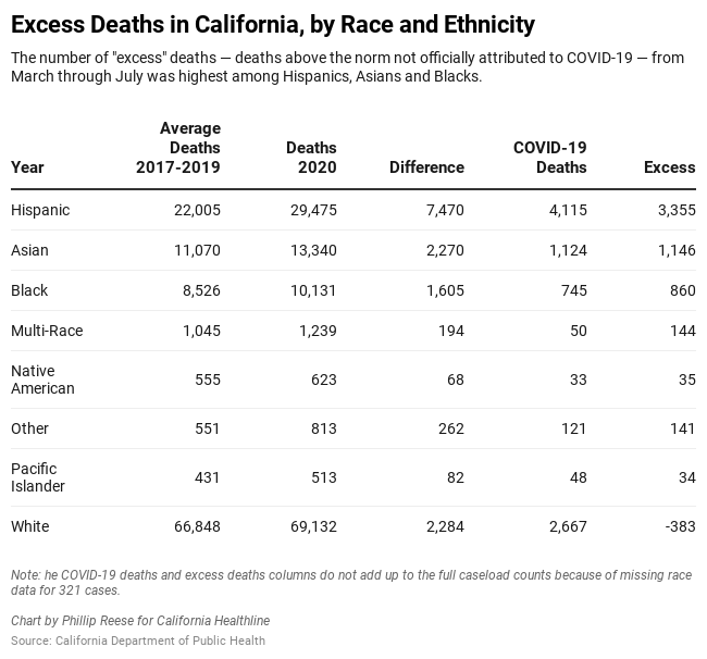 The overall number of excess deaths across all races and ethnicities was ultimately tempered because, compared with the three prior years, there were actually 383 fewer deaths among white Californians than would be expected in the absence of COVID-19. In addition, California Healthline adjusted the overall numbers to reflect more than 320 COVID deaths that could not be categorized by race or ethnicity because that information was missing from state records.