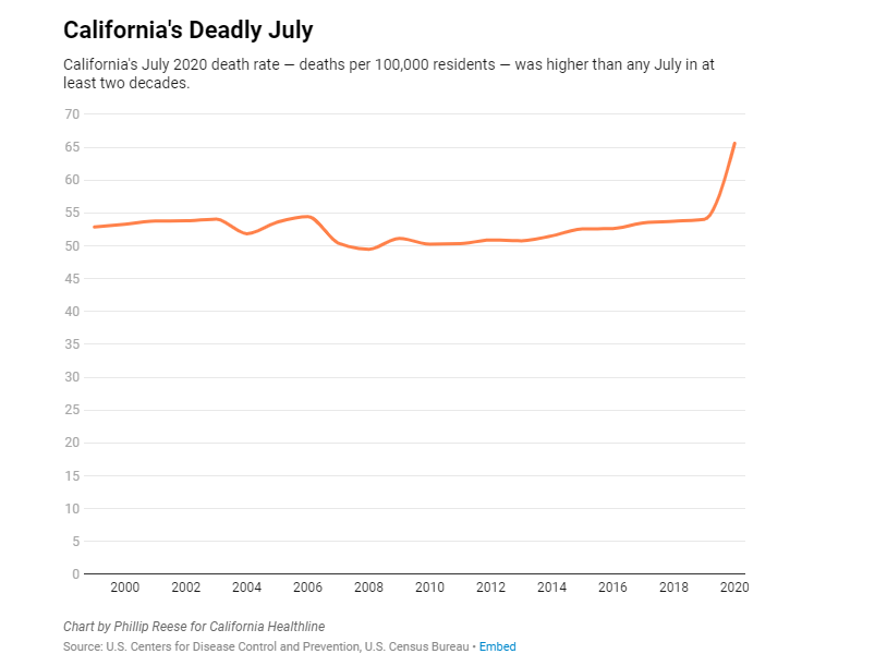 By the end of July, California had logged about 9,200 deaths officially attributed to COVID-19 in county death records. That left about 5,000 “excess” deaths for those months — meaning deaths above the norm not attributed to COVID-19. Deaths tend to increase from year to year as the population grows, but typically not by that much.