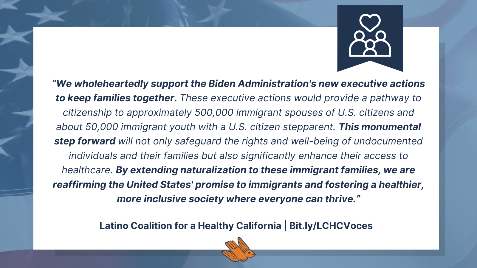 We wholeheartedly support the Biden Administration’s new executive actions to keep families together. These executive actions would provide a pathway to citizenship to approximately 500,000 immigrant spouses of U.S. citizens and about 50,000 immigrant youth with a U.S. citizen stepparent. This monumental step forward will not only safeguard the rights and well-being of undocumented individuals and their families but also significantly enhance their access to healthcare. By extending naturalization to these immigrant families, we are reaffirming the United States’ promise to immigrants and fostering a healthier, more inclusive society where everyone can thrive.